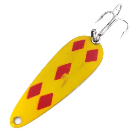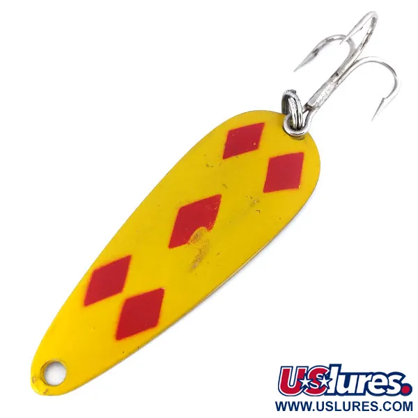 Tato plandavka o hmotnosti 28 g (1 oz) představuje osvědčené barevné schéma Five of Diamonds. Žlutý smalt je osázen pěti červenými kosočtverci, což je vzor, který definuje identitu značky již od roku 1929. Mosazná zadní strana je opatřena ražbou „LEN THOMPSON NO. 2“ a zemí původu Kanadou. Tento model s kódem 10774 si zachovává spolehlivý stříbrný trojháček spojený silným kroužkem. Stav je 4/5, s mírnými povrchovými stopami po skladování v krabičce. Silný kov je navržen tak, aby podporoval charakteristický pomalý kolébavý pohyb nástrahy při lovu hlubinných dravců.