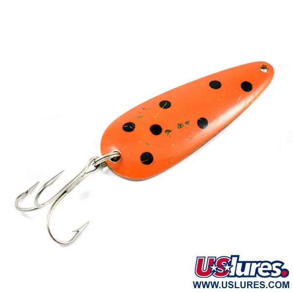 Tato kanadská klasika o délce 8 cm (3 1/4 palce) vyniká výrazným oranžovo-červeným povrchem a typickým vzorem s černými tečkami. Jasně vyražený nápis „LEN THOMPSON NO 2“ na mosazné zadní straně označuje nástrahu navrženou pro všestranné použití, ať už při trollingu na jezerní pstruhy nebo při nahazování do mělčin. Tento kus o hmotnosti 28 g (1 oz) nese kód produktu 2243 a demonstruje důraz značky na vyváženost. Nástraha je ve stavu 4/5, vykazuje lehké povrchové stopy a drobné oděrky barvy u okrajů, které jí dodávají patinu z doby strávené v krabičce na náčiní. Třpytka je osazena pevným stříbrným trojháčkem a její konstrukce je uzpůsobena pro pomalý, kolébavý pohyb, který napodobuje pohyb zraněné rybky. Spojovací kroužky zůstávají pevné a funkční, připravené k dalšímu nahození nebo pro místo v pečlivě udržované sbírce.
