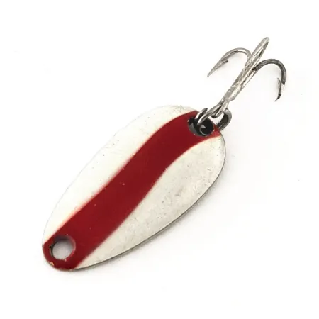 Na mosazné zadní straně je jasně vyraženo označení 'LEN THOMPSON NO. 6', které určuje původ této drobné plandavky. Tato nástraha vyrobená v Kanadě pod produktovým kódem 11312 má klasický bílý povrch doplněný výrazným červeným šikmým pruhem na přední straně. Plandavka měří přesně 2,5 cm (1") a váží lehkých 3,5 g (1/8 oz), přičemž je vyrobena z masivní mosazi. Osazení tvoří jeden stříbrný trojhák připevněný k širšímu konci pomocí pevného kroužku. Stav je hodnocen jako 5/5, emailové i kovové povrchy vypadají udržovaně a čistě. Historicky jsou tyto plandavky vyváženy pro pomalý kolébavý pohyb, což je technika používaná rybáři k napodobení malých rybek již od vzniku značky v roce 1929. Otvor pro vlasec je čistě vyražen na užším konci nástrahy.