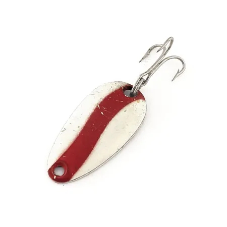 Výrazný diagonální červený pruh protíná krémově bílou přední stranu této kompaktní 2,5 cm (1 palec) plandavky. Tato vintage nástraha o hmotnosti 3,5 g (1/8 oz) nese produktový kód 11497 a představuje základní prvek v nabídce Len Thompson. Zadní strana má mosaznou povrchovou úpravu s jasným vyraženým označením modelu „NO. 0“, navzdory katalogovému označení #6. Rybáři na tyto plandavky spoléhají pro jejich charakteristický pomalý kolísavý pohyb při nahazování nebo trollingu na druhy, jako jsou pstruzi a okounovité ryby. Tento exemplář je ve stavu 5/5, vykazuje lehké povrchové opotřebení a jemné prasklinky v laku, spolu s určitým ztmavnutím a oxidací na mosazi a původním trojháčku. Kapkovitý profil je klasický pro Len Thompson, design vyráběný od roku 1929 k napodobení malých nástražních rybek.
