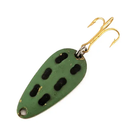 Zelený nátěr s výraznými černými oválnými značkami dodává přední straně této 5g (3/16oz) plandavky Len Thompson #7 její charakteristický vzhled. Tento exemplář o délce 3,4cm (1 1/4") se vyznačuje pevnou mosaznou konstrukcí viditelnou na zadní straně, kde je do kovu vyraženo jméno Len Thompson a logo ve tvaru osmičky. Výbava se skládá z trojháčku se zlatou povrchovou úpravou připevněného stříbrným kroužkem, což je konfigurace navržená pro odolnost při nahazování nebo trollingu v různých sladkovodních prostředích. Známky používání se projevují jako drobné oděrky barvy na okrajích a lehké povrchové stopy na mosazné zadní straně, což odpovídá zachovalému stavu 4/5. Tento v Kanadě vyrobený klasik s produktovým kódem 11191 využívá lisované mosazné tělo, které nabízí kovový záblesk v kontrastu k matně zelené přední straně. Vyražený nápis na zadní straně zůstává ostrý, což podtrhuje kvalitu dobového výrobního procesu.