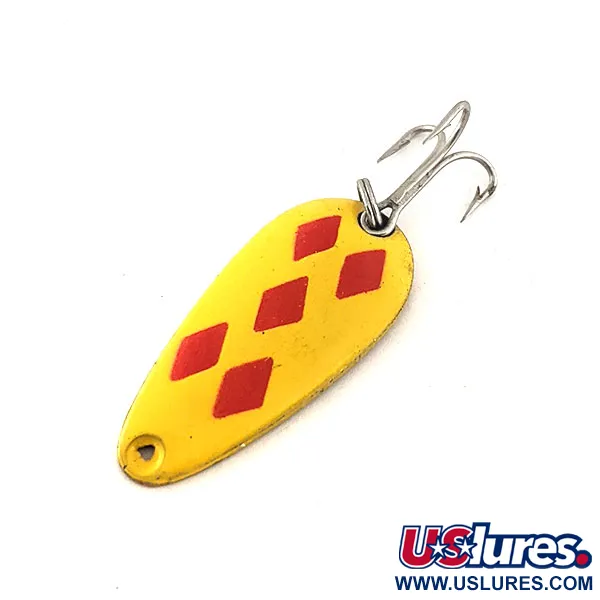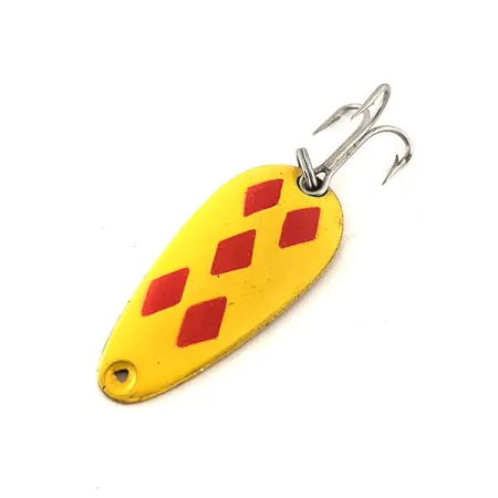 Pět červených kosočtverců je precizně nastříkáno na zářivě žlutém smaltu, což vytváří ikonický vzor „Five of Diamonds“, který tyto kanadské plandavky proslavil již od roku 1929. Tento exemplář je Len Thompson #7 o délce 3,4 cm (1 1/4") a hmotnosti 5 g (3/16 oz). Zadní strana má povrchovou úpravu z lesklé mosazi s hluboce vyraženou značkou výrobce „LEN THOMPSON No.7“, která potvrzuje její autentický původ. Nástraha je navržena pro různé techniky včetně přívlače a trollingu a je vybavena stříbrným trojhákem připevněným pomocí robustního kroužku. Plandavka, registrovaná pod produktovým kódem 11533, je ve stavu 5/5, má hladký povrch a vysoce kontrastní lakování. Kompaktní profil je specificky vyvážen tak, aby ve vodním sloupci napodoboval přítomnost malých nástražních rybek.