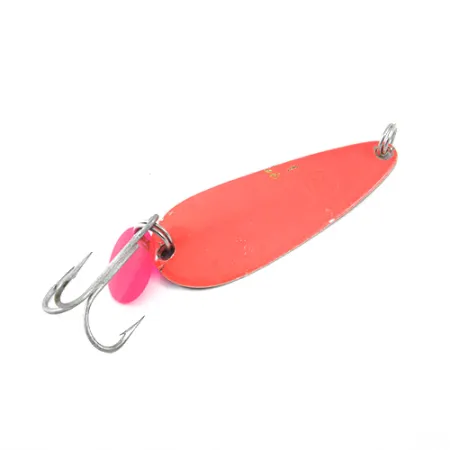 Tato plandavka s výrazným fluorescenčním oranžovým povrchem na vypouklé straně vynikne v každé sbírce historických nástrah. Tato klasika od Luhr Jensen vyrobená v USA váží 1/2 oz (14 g) a má zadní stranu z leštěného niklu, kde jsou jasně viditelná autentická ražení 'Les Devis' a 'HOT ROD'. Tělo měří 5,5 cm (2 1/4") a obsahuje unikátní neonově růžový plastový dráždivý disk namontovaný na zadním kroužku spolu s robustním trojháčkem. Tento exemplář s produktovým kódem 1285 je ve stavu 4/5 a vykazuje lehké známky stáří, které lze u dobře udržované nástrahy z této éry očekávat. Malý stříbrný kroužek v přední části slouží jako bod pro navázání vlasce a doplňuje jednoduché, ale účinné osazení typické pro vláčecí plandavky z poloviny minulého století.