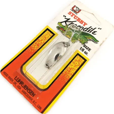 Poniklovaný povrch poskytuje čistý, reflexní vzhled této 3/16oz (4,5g) plandavce Lil' Kroc, známé také jako Krocodile Stubby. Vyrobeno společností Luhr Jensen pod produktovým kódem 12685, měří tato plandavka 1 1/4" (3,2 cm) a představuje kompaktní variantu jejich ikonické řady nástrah. Tento konkrétní kus je nepoužitý, uchovaný v původním vintage balení, které připomíná kořeny výrobce v Hood River v Oregonu. Balení obsahuje označení „Stubby“ a charakteristickou ilustraci krokodýla, přičemž nástraha je vybavena standardním trojháčkem. Na zadní straně sběratelé najdou historické souvislosti v podobě původních objednávkových informací z katalogu a regionální kontaktní údaje pro USA a Kanadu.