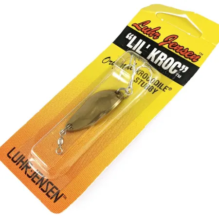 Tato kompaktní plandavka v leštěném provedení Gold váží 4,5 g (3/16 oz) a měří 3,2 cm (1 1/4 palce). Model Lil' Kroc (Krocodile Stubby) od značky Luhr Jensen nabízí díky kratšímu a širšímu profilu v porovnání se standardními plandavkami Krocodile specifické vlastnosti pro přesné nahazování. Tento exemplář nese kód produktu 1123-018-0002 (interní ref. 17153) a je zachován v původním dobovém balení z éry sídla společnosti v Hood River v Oregonu. Tělo z masivní mosazi je osazeno předním sudovým obratlíkem pro zamezení kroucení vlasce a ostrým zadním trojháčkem upevněným pomocí spojovacího kroužku. Tato nástraha nebyla nikdy použita a zůstává v originálním prodejním blistru. Na zadní straně karty se nachází vícejazyčná nabídka katalogu a razítko s datem výroby 21. října 1997.