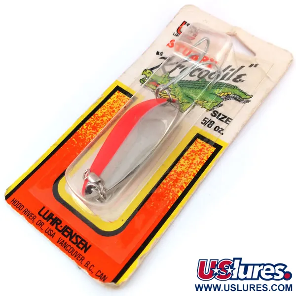 Červená a niklová povrchová úprava definují vysoce viditelnou estetiku této třpytky Lil' Kroc, varianty s kratším profilem z rodiny Luhr Jensen Krocodile, známé jako Stubby. S délkou 5,5 cm (2 1/4") a hmotností 14 g (1/2 oz) nabízí tato plandavka kompaktnější profil pro rybáře cílící na druhy, které preferují menší siluetu. Tato nástraha, vyrobená pod produktovým kódem 9996, odráží dlouholetou historii výroby společnosti Luhr Jensen v Hood River v Oregonu v USA. Tělo se vyznačuje silným kovem osazeným kvalitním hardwarem pro přívlač i trolling. Tento exemplář je nepoužitý, uchovaný v původním vintage obalu, s hodnocením stavu 6.