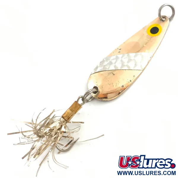 Hmotnost 10 g činí z této plandavky Lindy Finsel všestrannou volbu pro řadu sladkovodních druhů ryb. Zlatý povrch této 5,5 cm dlouhé plandavky se vyznačuje výrazným stříbrným pruhem se šupinatým vzorem uprostřed, který dodává reflexnímu povrchu kontrastní texturu. Výrazné žluté oko s černou zornicí je umístěno poblíž horního úchytu, zatímco na zadní straně je jasně vyražen název Finsel, což značí původ u Lindy / Little Joe v USA. Tento konkrétní model s kódem produktu 4527 je na trojháčku osazen stříbrným tinselovým ocáskem, který zajišťuje jemný třpyt. Při hodnocení stavu 4/5 vykazuje pozlacení lehké známky stáří s jemným, autentickým leskem. Konstrukci doplňují robustní kroužky navržené tak, aby odolaly tahu silného úlovku.