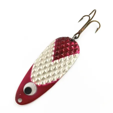 Základem této 55g (2 oz) plandavky Lindy Gator je poniklovaný povrch s diamantovou texturou. Návnada o délce 11,5 cm (4 1/2") se vyznačuje výrazným červenobílým lakováním na vyraženém šupinovém vzoru. Oblast hlavy zvýrazňuje sytě červený klín, zatímco zbytek těla tvoří bílý střed s červeným lemováním spodních hran. Tento exemplář, vyrobený v USA společností Lindy / Little Joe pod produktovým kódem 23586, je osazen velkým pohyblivým okem pro vyšší vizuální kontrast v blízkosti očka na provlečení vlasce. Výbavu tvoří robustní trojháček připevněný v zadní části pomocí spojovacího kroužku. Plandavka si zachovává stav 4/5, má jasný kovový povrch a syté barvy po celém těle.