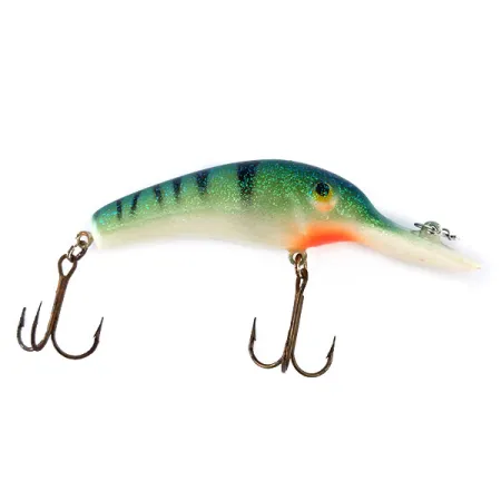 Tento Lindy Shadling s hmotností přesně 1/4 oz (7 g) je ukázkovým příkladem amerického řemesla 80. let od Lindy / Little Joe. Tělo o délce 5 cm (2") je vyvedeno ve sytém vzoru Okoun, který kombinuje třpytivý zelený hřbet s výrazným svislým žíháním na krémovém břiše. Pod hrdlem zářivě oranžová skvrna poskytuje klasický bod kontrastu pro sledující ryby. Tento konkrétní model, identifikovaný produktovým kódem 11104, zůstává ve stavu 5/5 a zachovává si svůj původní lesk na laku i kování. Dlouhá, integrovaná potápivá lopatka charakterizuje design typu Shadling, který se stal základem pro rybáře lovící hlubinné druhy. Sběratelé ocení zachování třpytivého povrchu, který byl pro nástrahy Lindy v této éře charakteristický.