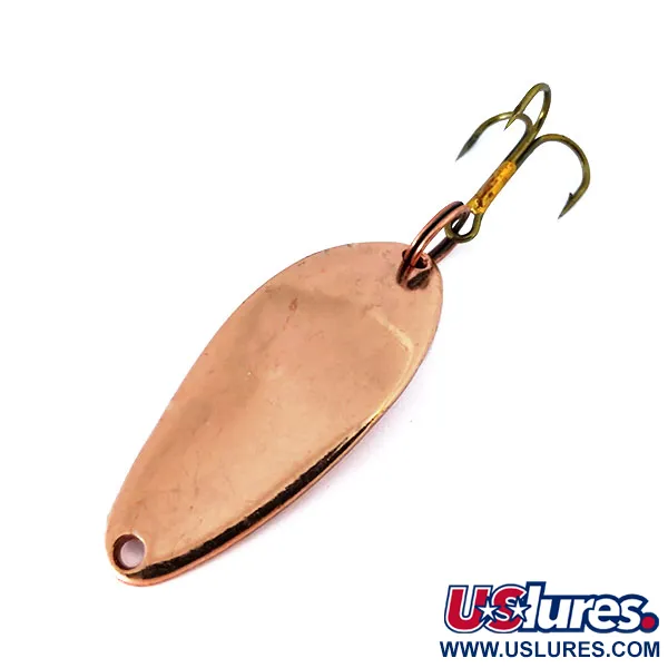 Tato třpytka o hmotnosti 7g (1/4 oz), označená produktovým kódem 10357, je vyrobena ze silného kovu s povrchovou úpravou v teplém měděném tónu a je dokladem raných let výroby společnosti Seneca Lure. Plíšek o délce 4cm (1 1/2") nese na konkávní straně ikonickou ražbu „Wigl-Lure“, což je detail specifický pro původní nástrahy Little Cleo vyráběné firmou Seneca předtím, než značku počátkem 80. let získala společnost Acme. Sběratelé ocení ostrost písma, které ji jasně identifikuje jako „A Seneca Lure“ vyrobenou v USA. Tvar kapky je doplněn robustním kroužkem a ostrým trojháčkem, čímž si zachovává původní osazení. Tento konkrétní kus zůstává ve vynikajícím stavu (hodnocení 5/5) a vykazuje vysokou kvalitu pokovení a řemeslného zpracování, které se od historického amerického náčiní očekává. Měděný povrch má čistý, reflexní charakter, který dává vyniknout unikátnímu značení.