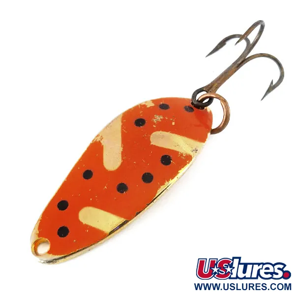 Výrazný červený povrch se zlatými cik-cak segmenty a černými tečkami zdobí přední stranu této 7g (1/4 oz) kovové plandavky. Na zadní zlaté straně je jasně vyraženo označení „LITTLE CLEO WIGL-LURE A SENECA LURE“, které potvrzuje, že se jedná o originální produkci původní společnosti Seneca z doby před jejím převzetím firmou Acme na začátku 80. let. Tato plandavka vyrobená v USA o délce 4 cm (1 1/2") nese kód produktu 10914. Výbava zahrnuje robustní bronzový trojháček připevněný přes kroužek, připravený k nahazování v tekoucích vodách i k trollingu u jezerních břehů. Stav je hodnocen stupněm 5/5, přičemž lak i kovový povrch si zachovávají svůj původní lesk. Kapkovitý profil kovového těla poskytuje potřebnou váhu pro daleké hody při zachování klasické siluety, díky které je tento model po desetiletí oblíbený u lovců pstruhů a lososů.