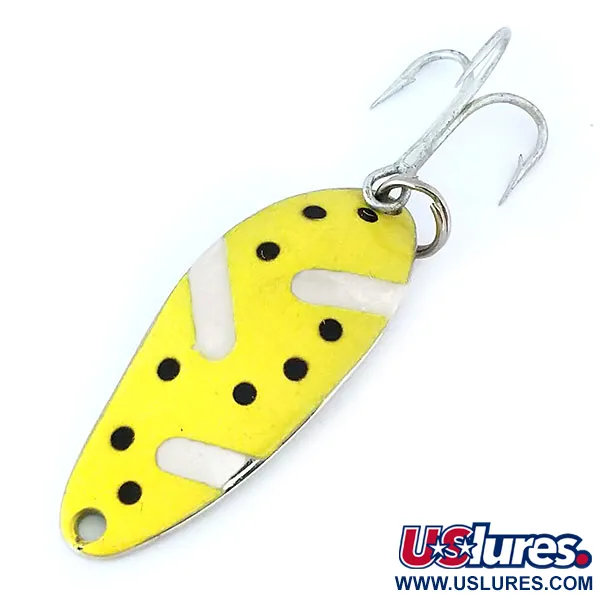 Zářivý žlutý smaltovaný povrch s výraznými černými tečkami charakterizuje tuto plandavku Little Cleo, klasickou americkou nástrahu o hmotnosti 1/4 oz (7 g). Tato plandavka o délce 1 1/2" (4 cm) vykazuje osobité dědictví z období před společností Acme s hluboce vyraženými nápisy 'SENECA LURE' a 'WIGL-LURE' na leštěné niklové zadní straně. Tento konkrétní exemplář, katalogizovaný pod produktovým kódem 11018, se vyznačuje nápadným vzorem černých skvrn na žlutém poli, rozděleným zakřivenými bílými pruhy, které dodávají kovovému tělu vizuální kontrast. Výbava se skládá z robustního trojhůčku připojeného k plandavce pevným ocelovým kroužkem. Stav je hodnocen 5/5, přičemž lakované i niklové povrchy vykazují vynikající zachování z původního výrobního období společnosti Seneca v USA.