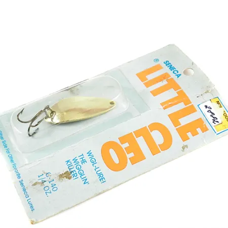 Pozlacení dodává této 7g (1/4 oz) plandavce nadčasový vzhled. Tato váhová kategorie se po desetiletí osvědčuje ve sladké i slané vodě. Seneca Little Cleo s produktovým kódem 2882 měří 4 cm (1 1/2") a představuje klíčovou éru v historii rybářského náčiní před akvizicí značky společností Acme na začátku 80. let. Tento exemplář je pozoruhodný zejména vyraženým motivem Hula girl na konkávní straně – detailem, o kterém se mnozí zkušení rybáři domnívají, že přispěl k legendárnímu statusu nástrahy dříve, než byl design zjednodušen. Nástraha je v nepoužitém stavu s hodnocením 6 a zůstává uzavřena v původním vintage blistru. Zadní strana karty uvádí sídlo divize Seneca v Providence na Rhode Islandu a obsahuje konkrétní pokyny k lovu přívlačí nebo trollingem pro cílové druhy, jako jsou pstruzi, lososi a štiky. Výbava zahrnuje továrně osazený trojháček, který nevykazuje žádné známky stáří ani opotřebení.