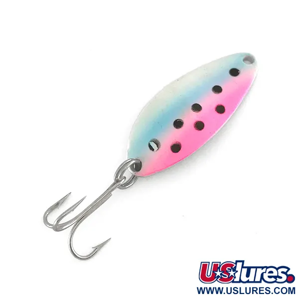 Hmotnost 7g (1/4 oz) poskytuje této plandavce potřebnou hustotu pro rychlé dosažení cílové hloubky při nahazování. Barevné provedení Trout je tvořeno třístupňovým přechodem z bílé přes modrou až po růžovou, doplněným řadou černých teček v širší části těla. Text „Little Cleo Wigl-Lure A Seneca Lure“ vyražený do leštěného niklového rubu potvrzuje, že tento předmět s kódem produktu 7937 vyrobila společnost Seneca v USA před jejím převzetím firmou Acme na začátku 80. let. Plandavka o délce 4 cm (1 1/2") je vybavena čistě vyraženým očkem pro vlasec a zadním trojháčkem. S hodnocením stavu 5/5 vykazuje nástraha minimální známky stáří, zachovává si čistotu malovaného vzoru pstruha i lesk kovového povrchu. Kroužky zůstávají pevné a funkční pro okamžité použití nebo vystavení.