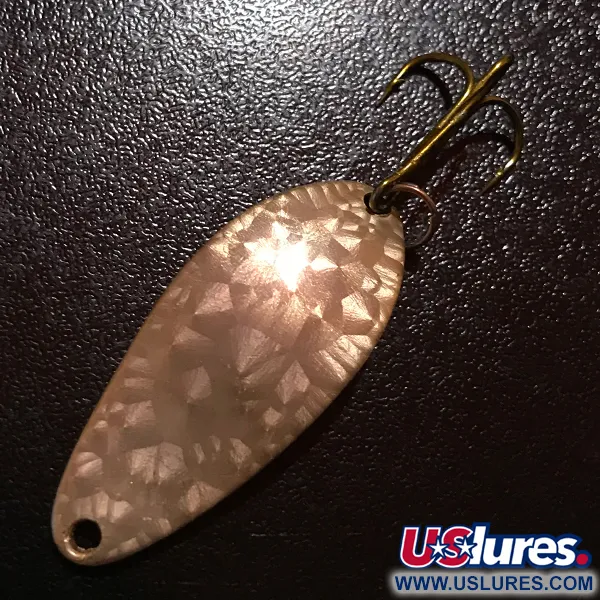 Tato třpytka s charakteristickou ražbou „Little Cleo Wigg-Lure A Seneca Lure“ na konkávní straně je autentickým kouskem historie amerického rybářského náčiní z doby, než společnost Seneca počátkem 80. let převzala firma Acme. Vzácná povrchová úprava Crystal, známá také jako Golden Scale, se vyznačuje mnohostrannou texturou připomínající rozbité sklo, navrženou tak, aby odrážela světlo z jakéhokoli úhlu. S hmotností 1/4oz (7g) a délkou 1 1/2" (4cm) zůstává tento exemplář ve stavu 5/5, vykazuje mimořádně čisté povrchy a zachovalý hardware. Klasický trojháček je bezpečně připevněn pomocí kroužku, což doplňuje tradiční kapkovitý tvar produktu s kódem 8430. Tato nástraha vyrobená v USA má tepanou přední stranu, která poskytuje vysoce kontrastní odlesky, jimiž se původní produkce Seneca odlišovala od pozdějších sérií.