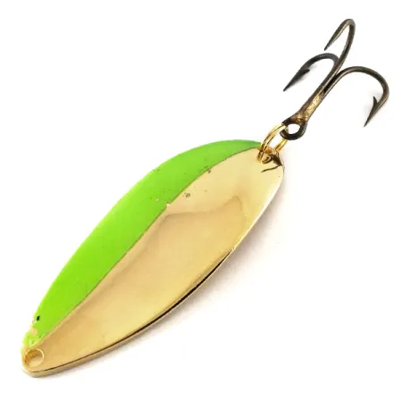 Tato plandavka s vyraženou hmotností 3/4 oz (21 g) na své leštěné zlaté konkávní straně zachycuje specifickou éru americké výroby rybářského náčiní. Tělo o délce 6,5 cm (2 1/2") nese legendární gravírování tanečnice „Hula Girl“, což je detail, který identifikuje originální produkci Seneca před akvizicí značky společností Acme na začátku 80. let. Tento exemplář, označený produktovým kódem 13241, se vyznačuje výraznou dělenou povrchovou úpravou přední strany, která kombinuje vysoce viditelnou fluorescenční zelenou s reflexní zlatou polovinou. Osazení zahrnuje robustní kroužek ve zlatém tónu a trojháček v tmavé povrchové úpravě, který zůstává v solidním stavu. Sběratelé tyto modely z éry Seneca vyhledávají právě kvůli logu tanečnice, o kterém se mnozí zkušení rybáři domnívají, že bylo významným faktorem historického úspěchu nástrahy. Povrch vykazuje lehké známky opotřebení odpovídající stáří, což odůvodňuje hodnocení stavu 4/5. Hluboko vyražené písmo a ikonická postava tanečnice u ocasu zůstávají jasné a dobře definované.