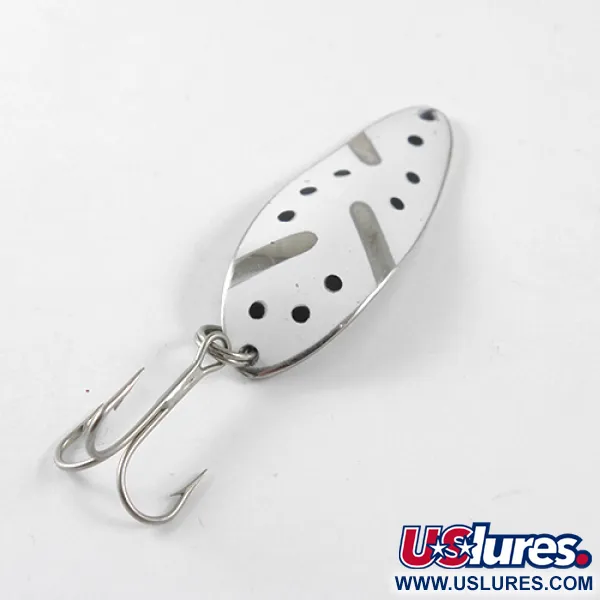 Výrazný bílý smaltovaný povrch zdobený černými tečkami a odhalenými niklovými pruhy definuje lícovou stranu této konkrétní plandavky. Little Cleo (Hula Girl) o hmotnosti 1/3 oz (10 g) nese na své leštěné niklové zadní straně výraznou ražbu „SENECA LURE“, což je znakem její výroby v USA před érou Acme. Tento exemplář o délce 1 3/4" (4,5 cm), označený kódem produktu 1441, nese ikonickou rytinu tanečnice, o které mnozí rybáři tvrdí, že je tajemstvím historického úspěchu nástrahy. Na rozdíl od moderních verzí si tato vintage produkce Seneca zachovává detailní postavu hula girl, doplněnou robustním trojháčkem zajištěným kroužkem. Niklovo-bílé barevné provedení zůstává ostré na celém těle v perfektním stavu 5/5. Sběratelé tyto originální kousky Seneca často vyhledávají, protože silueta byla speciálně navržena ještě před změnou značky na začátku 80. let. Zadní strana odráží světlo skrze leštěný kov a kontrastuje s lakovaným horním povrchem.