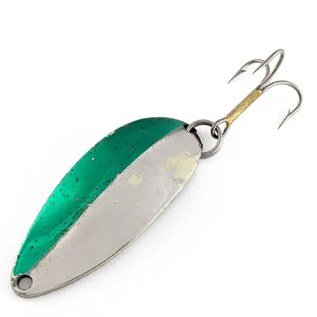 Přední stranu této 5,5 cm (2 1/4") plandavky rozděluje niklový a zelený metalický povrch, což z ní činí klasický výrobek firmy Seneca. Tato Little Cleo (HULA GIRL) nese na zadní straně ikonickou ražbu tanečnice, což je prvek vysoce ceněný sběrateli, který firma Acme po převzetí značky na začátku 80. let přestala používat. Zadní strana s ražbou „WIG-L LURE“ a názvem „LITTLE CLEO“ si zachovává leštěný lesk. Nástraha o hmotnosti 18 g (2/3 oz) je osazena trojhákem s výrazným dříkem ovinutým mosazí. Tento exemplář s produktovým kódem 20638 je ve stavu 4/5, přičemž vykazuje mírné běžné opotřebení na zeleně lakované části, které odráží jeho historii. Byla vyrobena v USA v éře, kdy byla „Hula Girl“ rybáři po celé zemi považována za talisman pro štěstí. Silný spojovací kroužek zajišťuje, že osazení zůstane bezpečně zajištěno i při nahazování.