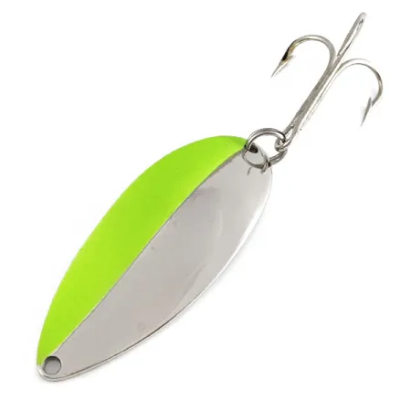 Tato robustní nahazovací plandavka o hmotnosti 21 g (3/4 oz) zaujme výrazným povrchem v kombinaci niklu a neonově zelené barvy. S délkou 6,5 cm (2 1/2") nese nástraha na své vnitřní straně ikonickou vyraženou tanečnici „Hula Girl“ – charakteristický detail z éry společnosti Seneca Lure Company. Mnoho zkušených rybářů stále nedá dopustit na tuto konkrétní verzi s „tanečnicí“, která pochází z doby před převzetím firmy značkou Acme na začátku 80. let, kdy bylo toto gravírování nakonec ukončeno. Tento exemplář s produktovým kódem 21764 je ve výjimečném stavu s hodnocením 5/5, má jasný povrch a původní osazení. Tato americká klasika disponuje hmotností ideální pro daleké hody do hlubokých vod, kde se nejlépe uplatní odlesky niklového povrchu.