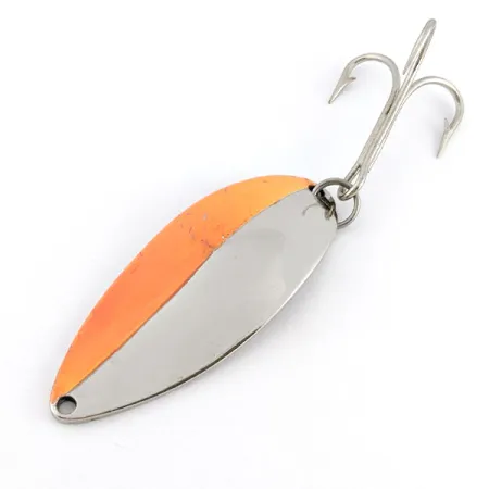 Tato plandavka Seneca s povrchovou úpravou v kombinaci niklu a sytě oranžové barvy, rozdělenou přesně uprostřed, okamžitě upoutá pozornost. Tento konkrétní kus o délce 6,5 cm (2 1/2") a hmotnosti 21 g (3/4 oz) má na zadní straně vyraženou klasickou tanečnici, což je poznávací znamení původní produkce společnosti Seneca Lure z doby před akvizicí firmou Acme v 80. letech. Mnoho zkušených sběratelů dává přednost těmto variantám „Hula Girl“, protože z pozdějších výrobních sérií byla tato rytina odstraněna. Leštěný kov je v perfektním stavu (5/5), bez výraznějších stop opotřebení továrního povrchu. Na zadní straně plandavky je vyražen kód produktu 22112 a také jasné označení hmotnosti a původu. Ve spodní části je pevně uchycen robustní trojháček, připravený pro klasickou přívlač nebo trolling.