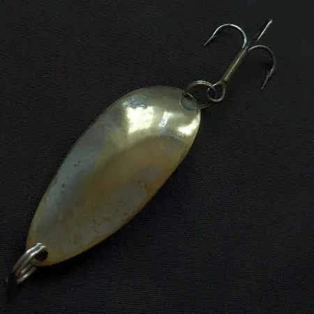Povrch této 5,5cm plandavky kombinuje mosazné a niklové tóny, což je typický vzhled pro původní výrobní linku Seneca. Tento konkrétní kus s produktovým kódem 22288 má na zadní straně legendární vyraženou tanečnici – detail, díky kterému si mezi zkušenými rybáři vysloužila přezdívku „Hula Girl“. Mnoho zkušených rybářů nedá na vyobrazení tanečnice dopustit; tento prvek byl odstraněn poté, co společnost Acme na začátku 80. let převzala firmu Seneca Lure. Díky hmotnosti 18 g poskytuje silnostěnný kov dostatečnou hmotnost pro daleké náhozy. Ražba na zadní straně jasně zobrazuje text „Wig-L-Lure“ spolu s údaji o výrobci, což potvrzuje její původ z éry americké produkce. Pokud jde o fyzický stav, nástraha odpovídá hodnocení 3/5, vykazuje viditelné opotřebení a zašlost původního pokovení, což odráží její stáří. Kroužky a trojháček zůstávají neporušené a pevně připevněné k tělu.