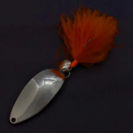 Trojháček tohoto kusu zdobí jasně oranžové peří, které vytváří výrazný kontrast k jeho leštěnému kovovému tělu. Tato plandavka Little Cleo (Hula Girl) z produkce firmy Seneca váží 14 g (1/2 oz) a měří 5,5 cm (2 1/4"). Na konkávní straně je jasně vyražená legendární tanečnice – charakteristický znak původní éry společnosti Seneca Lure, než značku v 80. letech převzala firma Acme a postavu z designu odstranila. Přestože záznam u kódu produktu 24349 uvádí barvu jako nickel/blue, tento konkrétní kus má vysoce leštěný niklový povrch s výrazným oranžovým akcentem u horního očka. Zkušení rybáři často přisuzují historický úspěch modelu Cleo právě tomuto specifickému gravírování, díky čemuž jsou tyto verze od Senecy vysoce ceněny sběrateli. Osazení nástrahy zůstává ve stavu 5/5.