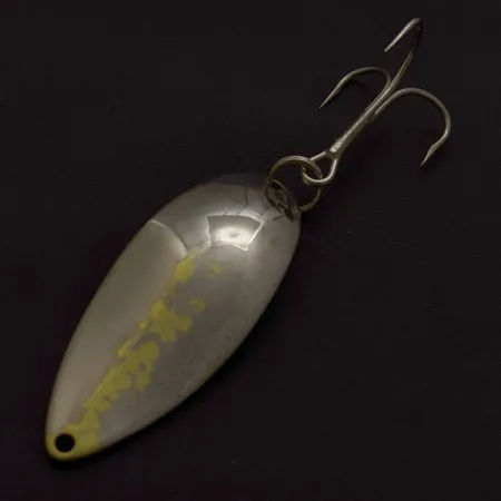 Na zadní straně této plandavky vyrobené firmou Seneca je jasně vyražena hmotnost 3/4 oz (21 g), umístěná hned vedle ikonické postavy 'Hula Girl', která definuje ranou éru modelu Little Cleo. S délkou 2 1/2" (6,5 cm) nabízí povrchová úprava Nickel/gold leštěnou chromovou stranu doplněnou o texturovaný vzor zlatého listu. Tento konkrétní exemplář, identifikovaný produktovým kódem 24360, představuje původní vizi Charlieho Clarka, newyorského hudebního skladatele, který v roce 1951 založil společnost Seneca Tackle. Zadní strana zobrazuje detailní rytinu tanečnice 'Cleo', jejíž vlnivé pohyby se Clark snažil napodobit, aby přilákal ryby. Vzhledem k tomu, že společnost Acme po akvizici firmy Seneca na začátku 80. let obrázek tanečnice zrušila, jsou tyto ražené verze vyhledávány těmi, kdo oceňují historické kořeny této nástrahy. Pevný spojovací kroužek spojuje s tělem trojháček v původním stylu. Nástraha je aktuálně ve stavu 4/5, kov si zachovává svůj lesk a ražba na zakřiveném povrchu zůstává ostrá a čitelná.