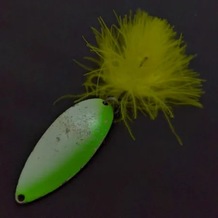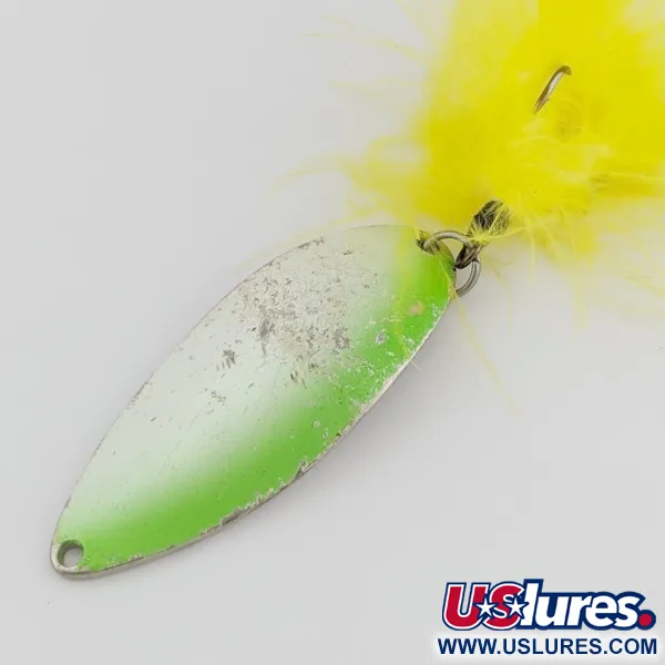 Tato plandavka o hmotnosti 3/4 oz (21 g) je opatřena raženou siluetou tančící dívky na své konkávní poniklované straně. Toto označení „Hula Girl“ je charakteristickým znakem původní produkce Seneca Lure z doby před akvizicí značky společností Acme na začátku 80. let. Přední strana vykazuje čistý přechod z leštěného niklu do zářivě zeleného provedení. Žlutý péřový dráždidlo dodává prezentaci extra objem. S délkou 2 1/2" (6,5 cm) je široké kovové tělo navrženo pro výrazný chod ve vodě. Ražené značení hmotnosti a značky zůstává na zadní straně jasně čitelné. Plandavka si zachovává čistý vzhled s hodnocením stavu 4/5. Kód produktu pro tuto nástrahu je 24504.