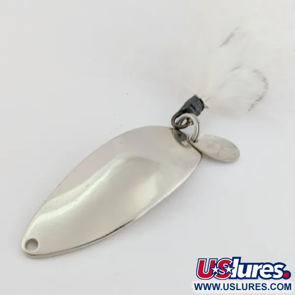 14 g raženého kovu dodává této niklované plandavce solidní váhu pro daleké hody. Na zadní straně se nachází ikonická silueta tanečnice „Hula Girl“, která byla poznávacím znamením původní produkce Seneca Lure předtím, než značku počátkem 80. let převzala společnost Acme. Mnoho rybářů věří, že právě toto logo tanečnice je tajemstvím úspěchu spojeného s původním modelem. Jasný niklový povrch zajišťuje vysokou viditelnost v různých vodních podmínkách. Plandavka o délce 5,5 cm se vyznačuje výrazným prohnutým profilem a trojháčkem s bílým peřím, který dodává jemný pulzující vizuální prvek. Hodnocení 5/5, kovový povrch zůstává výjimečně čistý a lesklý, přičemž původní ražba je ostrá a jasná. Tento konkrétní exemplář s kódem produktu 24509 pochází z éry před společností Acme.