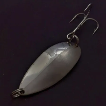 Niklový povrch s dvojí texturou definuje konvexní stranu této 21g plandavky a kombinuje vysoce leštěný zrcadlový povrch s jemným matným kartáčováním. Tento originál od Seneca Lure Co., mezi zkušenými rybáři známý jako model Hula Girl, nese na zadní straně vyraženou siluetu tančící dívky – prvek, který se vytratil, když výroba na začátku 80. let změnila majitele. Při délce 6,5 cm je silné kovové tělo navrženo pro dosažení značných nahazovacích vzdáleností. Niklování je dobrze zachovalé, hodnocené známkou 4/5 za čistý povrch a jasné ražení. Tato konkrétní plandavka vyrobená firmou Seneca představuje éru předtím, než byl detail tanečnice odstraněn z formy. Kód produktu: 24606.