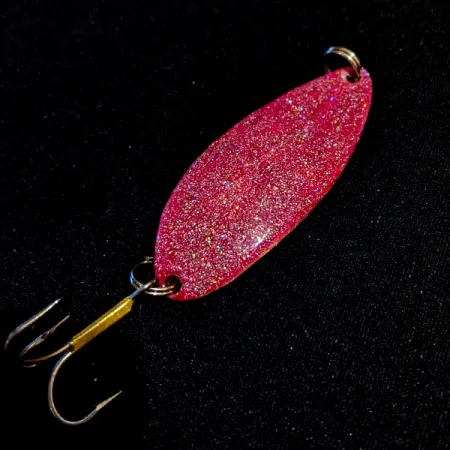 Růžový třpytivý povrch pokrývá vypouklou stranu této 14g (1/2 oz) plandavky a zajišťuje texturované odlesky ve vodě. Na zadní straně je do niklového pokovení vyražena klasická tanečnice „Hula Girl“ spolu se značkou Seneca Lure. Tyto originální verze od Seneca jsou vyhledávány těmi, kteří považují logo tanečnice za talisman pro štěstí. Tělo o délce 5,5 cm (2 1/4") má výrazný prohnutý tvar navržený pro stabilitu při nahazování i trollingu. Tato konkrétní plandavka je ve stavu 4/5, vykazuje mírné povrchové opotřebení odpovídající stáří, zatímco vyražená grafika zůstává jasně čitelná. Po akvizici společnosti Seneca na začátku 80. let se razítko tanečnice hula z výroby postupně vytratilo, což z tohoto kusu činí raný exemplář z éry Seneca. Kód produktu: 24623.