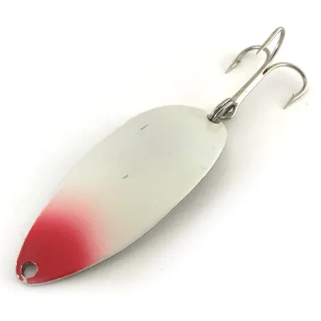 Tato originální plandavka Seneca Little Cleo (Hula Girl) o hmotnosti 1/2 oz (14 g) nese na své poniklované zadní straně ikonický ražený motiv tančící dívky. Tento konkrétní exemplář, katalogizovaný pod kódem 8715, se vyznačuje perleťově bílým povrchem s výraznou červenou špičkou na přední straně. Nástraha o délce 2 1/4" (5,5 cm) pochází z původní éry americké společnosti Seneca Lure, z období před akvizicí značky firmou Acme na začátku 80. let. Sběratelé tyto vintažní verze často vyhledávají, protože charakteristické gravírování Hula Girl bylo u moderních variant nakonec odstraněno. Konstrukce sestává z těla ze silného kovu osazeného pevným kroužkem a stříbřitým trojhákem. Povrchy jsou mimořádně čisté, což nástraze vyneslo hodnocení stavu 5/5 za skvěle zachovalý lak a lesklý niklový povrch.