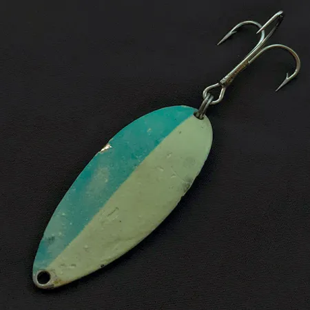S poctivou hmotností 3/4 oz (21 g) je tato klasická plandavka vynikajícím příkladem modelu 23040 z éry Seneca Lure. Přední strana 6,5 cm dlouhé nástrahy má výraznou dvoubarevnou povrchovou úpravu, svisle rozdělenou na sytě modrou a krémově bílou, která si zachovává schopnost svítit ve tmě. Na zadní straně najdete vysoce ceněnou niklovou úpravu s vyraženou původní tanečnicí Hula Girl, což je znak autenticity z doby předtím, než značku na začátku 80. let převzala společnost Acme. Mnoho zkušených sběratelů věří, že právě tento specifický symbol tanečnice stojí za skvělou pověstí, kterou si nástraha mezi rybáři vybudovala. Osazení zůstává robustní a zahrnuje pevný trojháček zajištěný silným kroužkem. Se stavem hodnoceným jako 4/5 vykazuje tělo přirozené známky používání v podobě drobných oděrek barvy na vypouklé straně, pod kterými prosvítá kov. Kapkovitý tvar plandavky je ideální pro nahazování i trolling a představuje klasiku pro lov větších dravých ryb. Na vyražené zadní straně nechybí ani nápis WIGL LURE, typický pro styl produkce Seneca v tomto období.