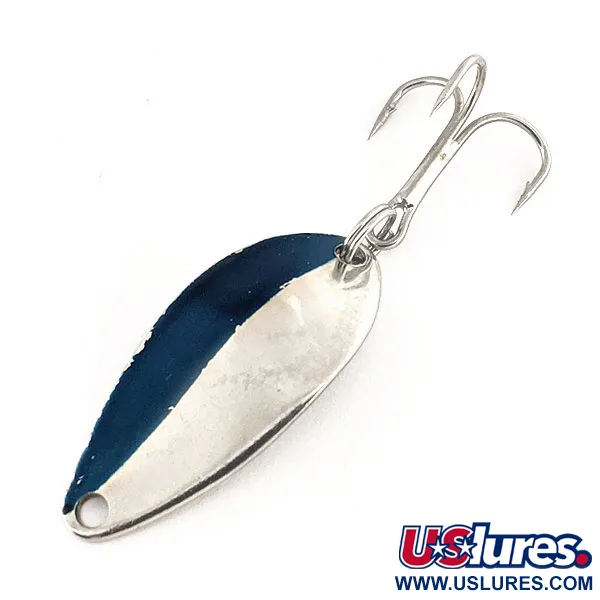 Výrazný tmavě modrý pruh pokrývá zhruba polovinu leštěného niklového povrchu této 4g (1/8oz) plandavky. Tato plandavka Little Cleo z produkce Seneca o délce přesně 3 cm (1 1/4") představuje éru před 80. lety minulého století, než značku získala společnost Acme Tackle Company. Na zadní straně je klasická ražba «LITTLE CLEO» jasně vyražená do kovu, což je charakteristický znak původního designu Seneca Lure z USA. Vzhledem k jejímu stáří zůstává povrchová úprava v kondici 5/5, přičemž si zachovává brilantní zrcadlový odlesk na niklování a čisté, ostré hrany modré barvy. Je osazena originálním trojháčkem zajištěným pevným kroužkem a je určena pro techniky přívlače a trollingu. Tato plandavka, označená produktovým kódem 12196, má unikátní hrbatý tvar navržený pro specifický kolébavý pohyb ve vodě. Kapkovitý profil zůstává jednou z nejznámějších siluet v historii amerického rybářského náčiní, zejména z tohoto historického výrobního období Seneca.
