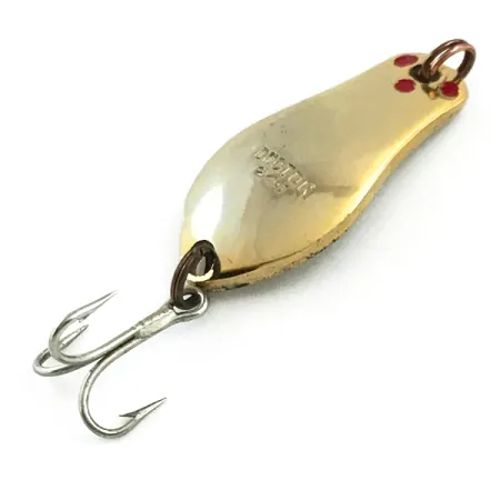 Značka DOCTOR 245 jasně vyražená do pozlaceného kovu identifikuje tuto kompaktní plandavku jako klasickou nabídku od Prescott Spinner. Tato nástraha o hmotnosti 5,5 g (3/16 oz) a délce 3 cm (1 1/4") se vyznačuje třemi výraznými červenými tečkami u horního kroužku, což je charakteristický vizuální znak tohoto modelu. Povrchová úprava Nikl / Zlato zůstává jasná a dobře zachovalá na celém těle ve tvaru kapky, díky čemuž si tento exemplář vysloužil vynikající hodnocení stavu 5/5. Tato nástraha vyrobená v USA, registrovaná pod kódem produktu 6016, je osazena originálním příslušenstvím, včetně ostrého trojháčku a robustních kroužků určených pro přívlač a trolling. Konvexní strana listu odráží světlo skrze leštěné pokovování, což je charakteristický znak americké výroby rybářského náčiní z poloviny století.