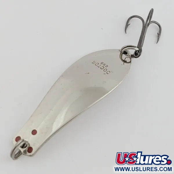 Tato poniklovaná plandavka od Prescott Spinner s ražbou „DOCTOR 255“ na vnitřní straně měří 4,5 cm (1 3/4"). Hmotnost 7 g (1/4 oz) a tělo z masivní mosazi umožňují nástraze udržet stabilní chod při různých rychlostech navíjení. Tři malé červené tečky umístěné poblíž očka vytvářejí jemný vizuální kontrast k lesklému kovovému povrchu. Štíhlý tvar vrbového listu je navržen tak, aby napodoboval profil malé nástražní rybky, což je design často upřednostňovaný při lovu štik nebo pstruhů. Tento konkrétní exemplář je ve stavu 5/5, má čistý povrch a velmi čitelnou ražbu. Pod produktovým kódem 24455 se jedná o zachovalou ukázku rybářského náčiní z poloviny minulého století.