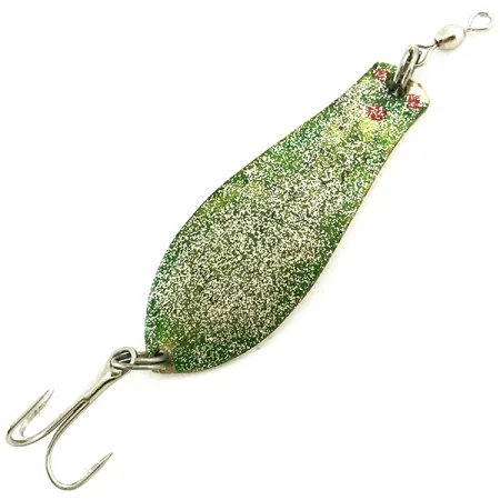 Povrch této 4,7 cm kovové plandavky, která je poznávacím znamením značky Prescott Spinner, pokrývá povrchová úprava Golden Glitter a Green Glitter. Little Doctor 255 s hmotností 7 g se vyznačuje kapkovitým profilem navrženým pro nahazování nebo trolling. U hlavy na zelené straně je viditelná řada červených teček, které slouží jako bod útoku pro dravé ryby. Tento konkrétní exemplář, označený produktovým kódem 5689, si zachovává původní osazení včetně ostrého trojháčku a horního válečkového obratlíku. Stav je hodnocen 5/5, povrchy jsou pozoruhodně zachovalé a barvy zůstávají jasné a syté. Tato nástraha, původně vyrobená v USA, představuje styl povrchových úprav populární u amerických kovových nástrah poloviny století, kde byly flitry nanášeny hustě pro maximální viditelnost pod vodou. Kroužky zůstávají pevné.