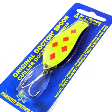 Výrazné červené kosočtverce ostře kontrastují se zářivě žlutým základem této třpytky o hmotnosti 1/3 oz (10 g). Little Doctor 265 s produktovým kódem 0780 měří 2 1/2" (6,5 cm) a je uchována v původním modrém kartonovém balení. Tento konkrétní kus je nepoužitý, díky čemuž je zachován tovární smalt i ostrý trojháček. Jako produkt značky Prescott Spinner, která byla divizí proslulé společnosti Fred Arbogast, nese tato v USA vyrobená nástraha na kartě klasické označení „2 in 1 Spoon“. Žlutá povrchová úprava zajišťuje vysokou viditelnost, zatímco název „Doctor Spoon“ a značka jsou jasně vyraženy na kovové zadní straně.