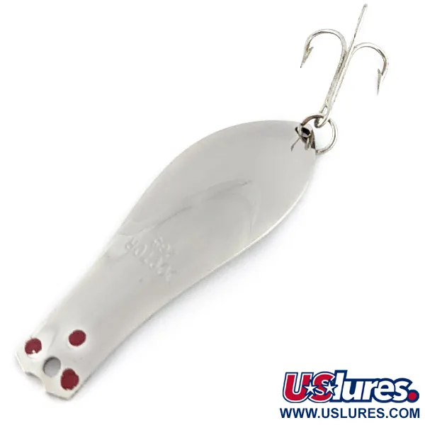 Tato plandavka v niklovém provedení od výrobce Prescott Spinner o hmotnosti 10 g (1/3 oz) představuje trvalou kvalitu amerického rybářského náčiní z poloviny minulého století. S délkou 6,5 cm (2 1/2") se model Little Doctor 265 vyznačuje čistou konvexní stranou, na které je do kovu jasně vyražen název modelu. Tři výrazné červené tečky umístěné poblíž očka pro navázání vytvářejí ostrý vizuální kontrast k reflexnímu stříbrnému tělu. Tento exemplář je ve stavu 5/5, má jasný, nepoškozený povrch a zachovává si svůj původní lesk. Nástraha je osazena robustním trojháčkem připevněným pomocí spojovacího kroužku, což je konfigurace určená pro nahazování i trolling. Na zadní straně je kov v identickém hladkém niklovém provedení, což odráží jednoduchou, ale účinnou konstrukci tohoto amerického výrobce.