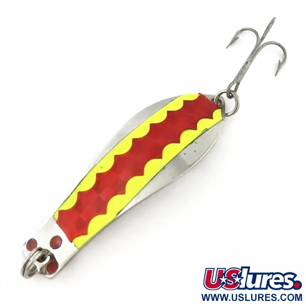 Zářivě žlutá a červená vroubkovaná samolepka s reflexní texturou připomínající diamant definuje vizuální profil této 6,5cm (2 1/2") plandavky. Prescott Spinner „Little Doctor 265“ o hmotnosti 10 g (1/3 oz) je vyrobena z leštěného niklového základu a představuje klasickou americkou výrobu z USA. Tři výrazné červené tečky jsou umístěny poblíž spodního kroužku a vytvářejí barevný bod v místě, kde se vlasec připojuje k široké části. Na opačném, užším konci je pomocí pevného kroužku osazen trojháček. Zadní strana nástrahy je v čistém, hladkém niklu, což zdůrazňuje funkční kovové zpracování tohoto vintage designu. S hodnocením 5/5 je tento exemplář (kód produktu 23977) pozoruhodně zachovalý, přičemž dekorativní prvky i kovový povrch zůstávají jasné a neporušené.