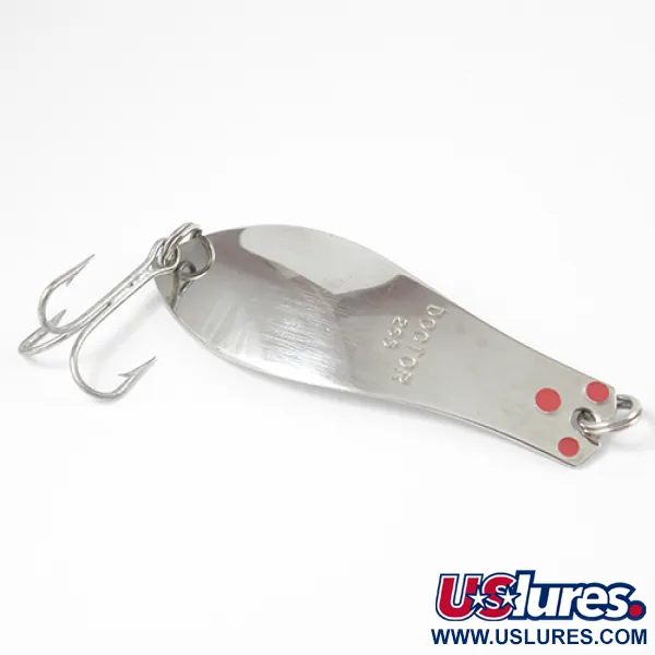 Poniklovaný povrch tohoto 6,5 cm těla odráží světlo s čistým, zrcadlovým leskem, který je typický pro vysoce kvalitní nástrahy Prescott Spinner. Jasně vyražené označení „DOCTOR 265“ do kovu doplňují tři výrazné červené tečky u očka pro uchycení šňůry. Tato v USA vyrobená plandavka o hmotnosti 10 g je navržena pro přívlač nebo trolling. Výbava zahrnuje ostrý trojhák a dvojité kroužky, vše ve výjimečném stavu. Tento konkrétní kus s kódem 2584 má hodnocení stavu 5/5, přičemž si zachovává jasnou niklovou barvu po celém svém protáhlém profilu. Klasický kapkovitý tvar se směrem k horní části zužuje, kde je kov o něco užší pro připevnění vlasce.