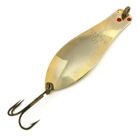 Tato plandavka o hmotnosti 1/3 oz (10 g) zůstává univerzální volbou pro různé druhy sladkovodních ryb. Do pozlaceného kovu je jasně vyražen název „DOCTOR 265“, který ji identifikuje jako klasickou nástrahu vyrobenou v USA. Tento exemplář o délce 2 1/2" (6,5 cm) má poblíž horního očka dva výrazné červené body, které vytvářejí vizuální kontrast k kovovému tělu. Výbava se skládá z robustního trojháčku připevněného pomocí kroužku na ocasu a odpovídajícího kroužku na hlavě pro upevnění vlasce. Pod produktovým kódem 7693 vykazuje pozlacení lehké známky používání, přičemž si zachovává solidní hodnocení stavu 4/5. Konvexní strana si zachovává lesk, zatímco konkávní zadní strana vykazuje o něco matnější, starozlatý tón typický pro kovové nástrahy z této éry.