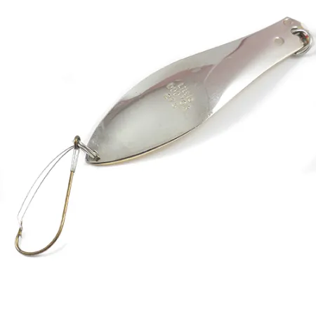 Dvoukovové pokovení je charakteristickým znakem tohoto klasického designu s výrazným kontrastem mezi lesklým zlatým a niklovým povrchem. Branding „Little Doctor 275“, jasně vyražený do kovu, zůstává ostrý na konkávní straně plandavky, která měří 9 cm. Tento exemplář Prescott Spinner, označený kódem produktu 1960, váží 21 g, což poskytuje dostatek hmotnosti pro daleké náhozy nebo dosažení spodních vrstev vodního sloupce. Osazení je obzvláště zajímavé a skládá se z velkého jednoháčku vybaveného drátěnou ochranou proti vázkám pro usnadnění pohybu v podvodní vegetaci. Povrchy, hodnocené stavem 5/5, si zachovávají jasný, zrcadlový lesk. Robustní kroužek v přední části zajišťuje spolehlivé spojení s návazcem. Vyrobeno v USA, nástraha je robustní a jednoháček zůstává z výroby ostrý a bezpečně upevněný.