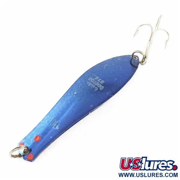 Výrazná modrá metalíza definuje tento kus a vytváří živý kontrast k lesklému poniklování. Tato plandavka Little Doctor 275, vyrobená firmou Prescott Spinner v USA, váží 21 g (3/4 oz) a měří 9 cm (3 1/2"). Tři výrazné červené tečky umístěné u spodního kroužku slouží jako klasický vizuální spouštěč, který vyniká v barevném schématu Light Blue / Nickel / Blue. Na lici nástrahy je jasně vyražen název modelu a v katalogu je vedena pod kódem produktu 24207. Kovové tělo i trojháček jsou ve vynikajícím stavu, což tomuto kusu dává hodnocení 5/5. Představuje skvěle zachovalý příklad historie amerického rybářského náčiní s kapkovitým tvarem navrženým pro efektivní nahazování nebo trolling.