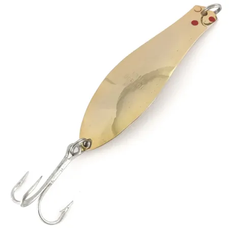 Leštěné zlacení pokrývá široký povrch této v USA vyrobené třpytky, která poskytuje vysokou viditelnost pro nahazování nebo trolling. Tato Prescott Spinner Little Doctor 275, vedená pod kódem produktu 7792, měří 9 cm (3 1/2") a váží 21 g (3/4 oz). Tři výrazné červené tečky se nacházejí na vnitřní konkávní straně poblíž očka a slouží jako jemný vizuální spouštěč často spojovaný s touto sérií. Na vnitřní straně kovu je vyražen název modelu a výrobce, což odkazuje na její klasický původ. Spolehlivé kroužky zajišťují hardware na obou koncích a drží čistý trojháček, který nevykazuje žádné známky opotřebení. Tento exemplář si zachovává vynikající vzhled, což odpovídá hodnocení stavu 5/5.