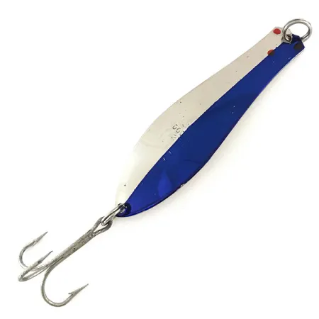 Váha 21 g dodává plandavce Prescott Spinner Little Doctor 275 potřebnou hmotnost pro nahazování i trolling. Přední strana třpytky se vyznačuje čistým děleným povrchem Nikl / Modrá, který zvýrazňuje malý červený detail oka u upevňovacího kroužku. Do kovového těla je jasně vyražen kód 9106, který slouží jako spolehlivý identifikátor tohoto vintage nástrahy vyrobené v USA. Při délce 9 cm si nástraha zachovává štíhlý profil s plně poniklovanou zadní stranou, která odráží světlo ve vodním sloupci. Tento exemplář je ve stavu 5/5 a vykazuje pozoruhodně čisté povrchy jak na kovovém těle, tak na originálním trojháčku.