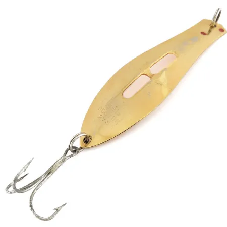 Zářivě zlatý povrch pokrývá celou 9 cm (3 1/2") plochu této klasické trollingové plandavky. Společnost Prescott Spinner Company navrhla model Little Doctor 275 s unikátním vyfrézovaným středem, což je funkční podpis jejich vintage řady. Do kovového těla o hmotnosti 17 g (3/5 oz) je jasně vyražen název modelu a velikost, což odkazuje na jeho profesionální původ. Tento konkrétní kus je ve stavu 5/5, přičemž si zachovává čistý a reflexní povrch v celém svém protáhlém profilu. Je osazena robustním trojháčkem připevněným přes pevný kroužek a je konstruována speciálně pro trolling, kde jsou klíčové hmotnost a profil. Značka výrobce zůstává ostrá a celkové zpracování odráží kvalitativní standardy výroby rybářského náčiní z poloviny století pod produktovým kódem 9649.