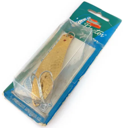 Tepané zlacení pokrývá celý povrch této 9cm (3 1/2") plandavky, kterou doplňují výrazné červené tečky u horního očka. Little Doctor 275 o hmotnosti 21 g (3/4 oz) představuje klasický univerzální design od společnosti Prescott Spinner Co., která se později stala součástí výroby KOTCO v Akronu v Ohiu. Tento konkrétní kus s kódem produktu 9748 je uchován v původním vintage blistru. Nástraha samotná je nepoužitá a vykazuje vysoký lesk a reflexní kvalitu tepaného kovového povrchu. Série „Doctor“ je známá svou oboustrannou všestranností; ačkoliv je zde osazena odolným stříbrným trojháčkem na širším konci, konstrukce umožňuje upevnění vlasce na obou stranách pro změnu hloubky a odporu při trollingu nebo castingu. Zadní strana balení potvrzuje její účinnost při lovu větších druhů, jako jsou štiky, muskungy a candáti.