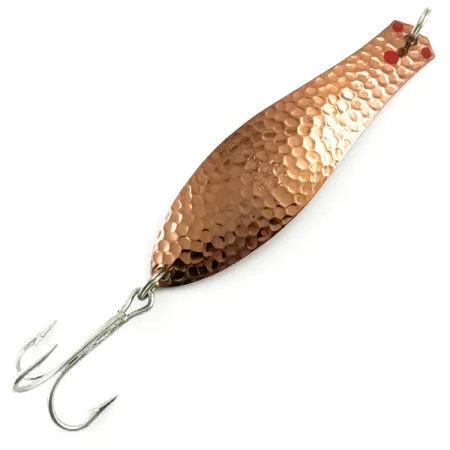 Povrchová úprava v podobě tepané mědi u tohoto modelu byla navržena tak, aby zachycovala a odrážela světlo do různých směrů, což je technika dlouhodobě oblíbená americkým výrobcem Prescott Spinner. Plandavka Little Doctor 275 Lite (Kód 6030) o hmotnosti 17 g (3/5 oz) se vyznačuje výrazným tepaným povrchem na konvexní straně, který kontrastuje s hladkou, leštěnou mědí na straně zadní. Dva malé červené barevné akcenty jsou umístěny poblíž horního očka a vytvářejí jemný kontrastní bod vůči teplému kovovému tónu. S délkou 9 cm (3 1/2") je nástraha vybavena robustním trojháčkem ve stříbrném provedení, který je zajištěn pevným spojovacím kroužkem. Ražba výrobce je v kovu jasně viditelná a potvrzuje původ v USA. Tento exemplář je ve vynikajícím stavu s hodnocením 5/5, má čistý hardware a jasný lesk. Silný hák a masivní kovové tělo naznačují, že jde o nástrahu stvořenou pro přívlač a trolling, kde je odolnost prvořadá.