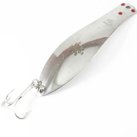 Tato specifická varianta „Thin“ modelu Little Doctor o hmotnosti 3/5 oz (16 g) byla navržena pro trolling, kde je upřednostňován lehčí a aerodynamičtější profil před těžšími modely pro nahazování. Povrchová úprava z leštěného niklu je doplněna třemi výraznými červenými tečkami umístěnými poblíž očka na vlasec, což je charakteristický designový prvek společnosti Prescott Spinner z Prescottu ve Wisconsinu. Plandavka o délce 3 1/2" (9 cm) má na přední straně jasně vyražené označení modelu „Little DOCTOR 27S“ spolu s původem výrobce. Tento konkrétní exemplář je ve stavu 5/5, zachovává si svůj jasný, reflexní povrch a původní stříbrný trojhák. Konstrukce je vybavena kroužkem na ocase, který zajišťuje bezpečné uchycení hardwaru během dlouhých trollingových jízd. Nástraha vyrobená v USA představuje funkční jednoduchost vintažního náčiní z poloviny století a využívá zúžený tvar těla k dosažení zamýšlené hloubky bez nadměrného objemu. Spodní strana je vyvedena ve stejném vysoce lesklém niklu, což zajišťuje konzistentní záblesky z více úhlů.
